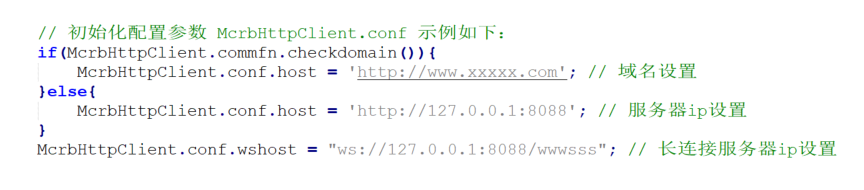 第二步:配置接口服务地址 McrbHttpClient.conf.host = 'http://127.0.0.1:8080'