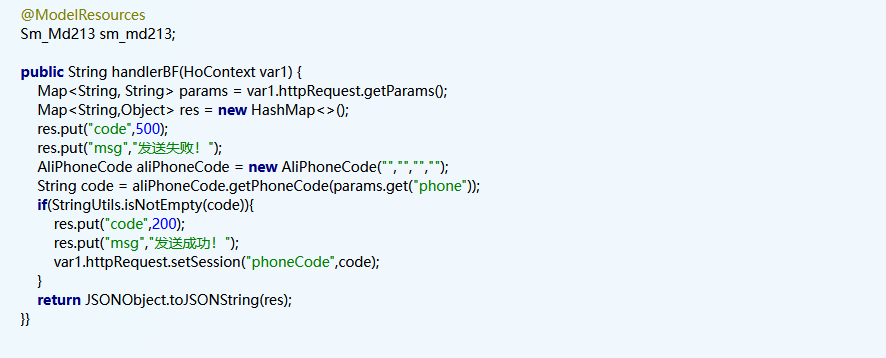 2、调用获取验证码方法getPhoneCode传入phone电话号码即可发验证码送消息到对应的手机号且返回这个发送的验证码以供后续使用。