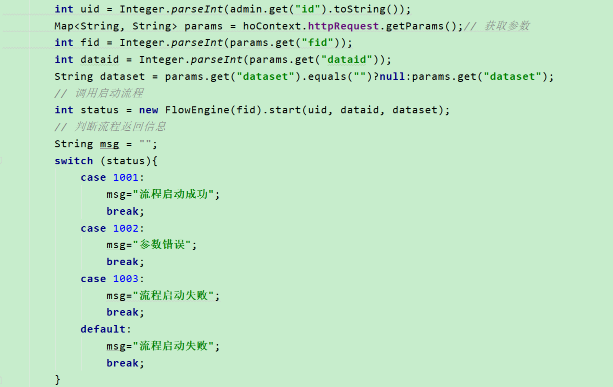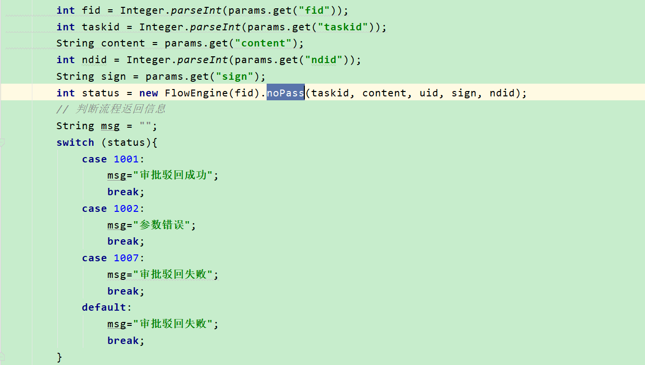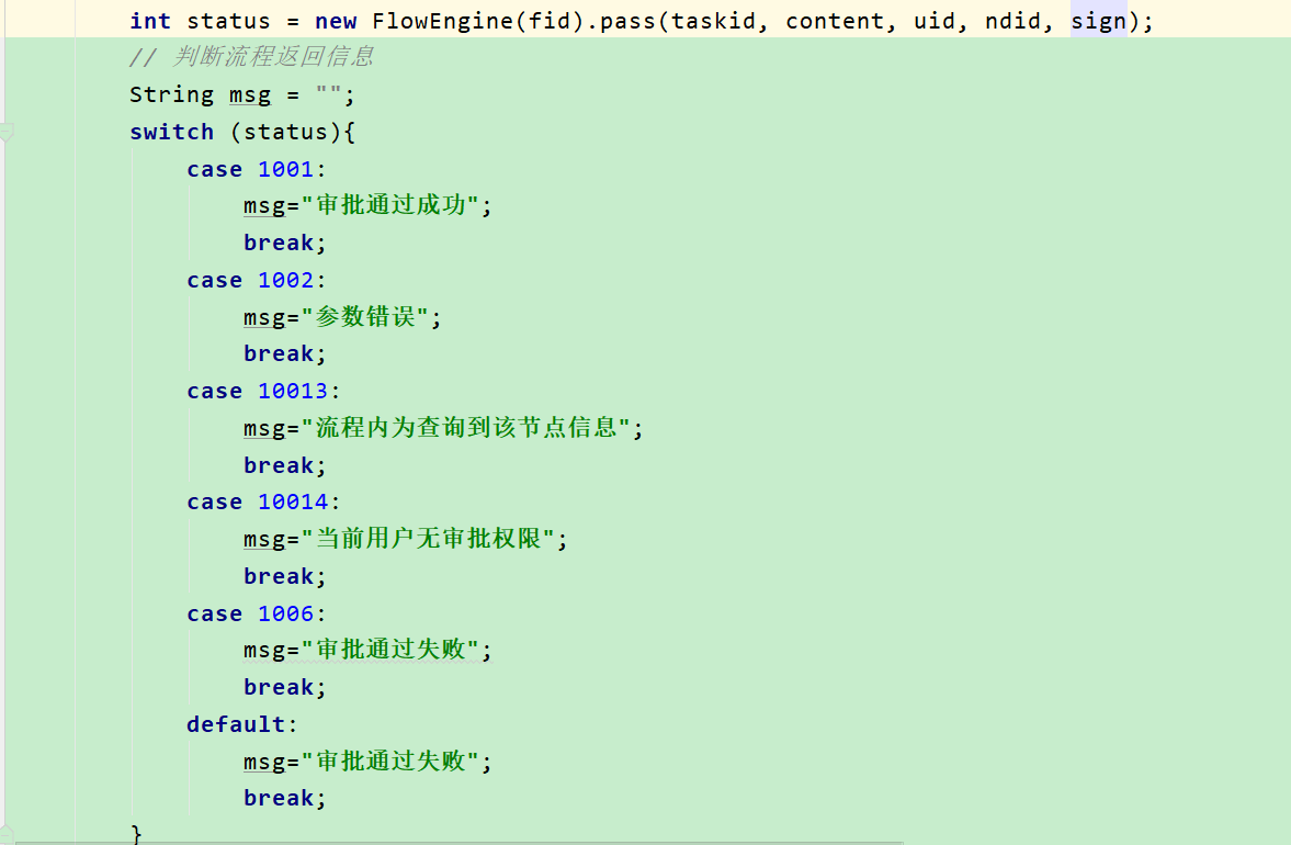 程序定义FlowEngine类构造方法strat、pass、noPass方法,start启动流程传入参数:uid, dataid, dataset;pass通过流程传入参数:taskid, content, uid, ndid, sign;noPass驳回流程传入参数:taskid, content, uid, sign, ndid。