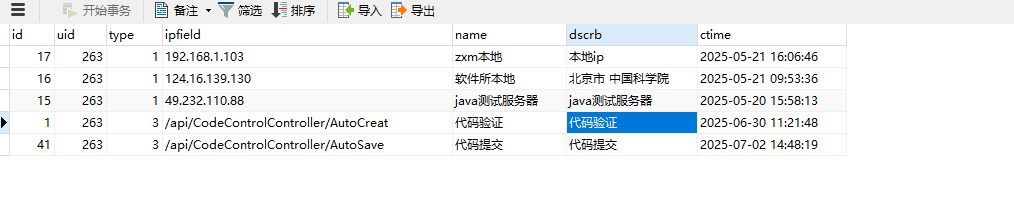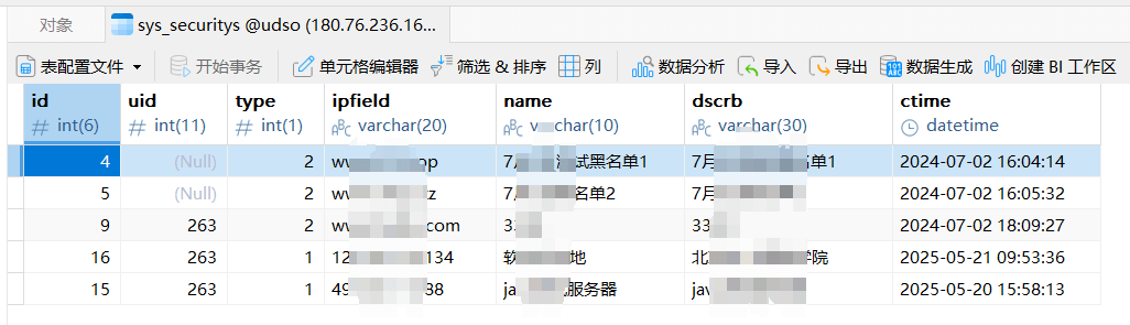 内部开发人员也可以通过直接增加数据库表数据进行新增黑白名单,数据库表为sys_securitys。